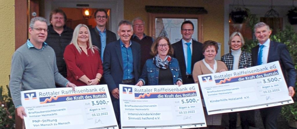 Meistbietend wurden die Gutscheine bzw. Tauben auf einer speziellen Plattform versteigert. Die Käufer kamen aus den Niederlanden, Tschechien, Frankreich, Kroatien, Österreich und Deutschland. Für die Gutscheine erhalten die Käufer dann beim jeweiligen Spender eine entsprechende Brieftaube. Den tiergerechten Transport der Tauben müssen die Käufer dann organisieren. Kaum einer der angefragten Züchter sagte Nein. Fast alle unterstützten die Aktion mit einer „Taubenspende“. Insgesamt wurden so 17000 Euro erzielt, die die Rottaler Raiffeisenbank auf 20000 Euro aufrundete. Nun wurden die Spendenschecks in einer kleinen Feierstunde an soziale Projekte der Region übergeben.