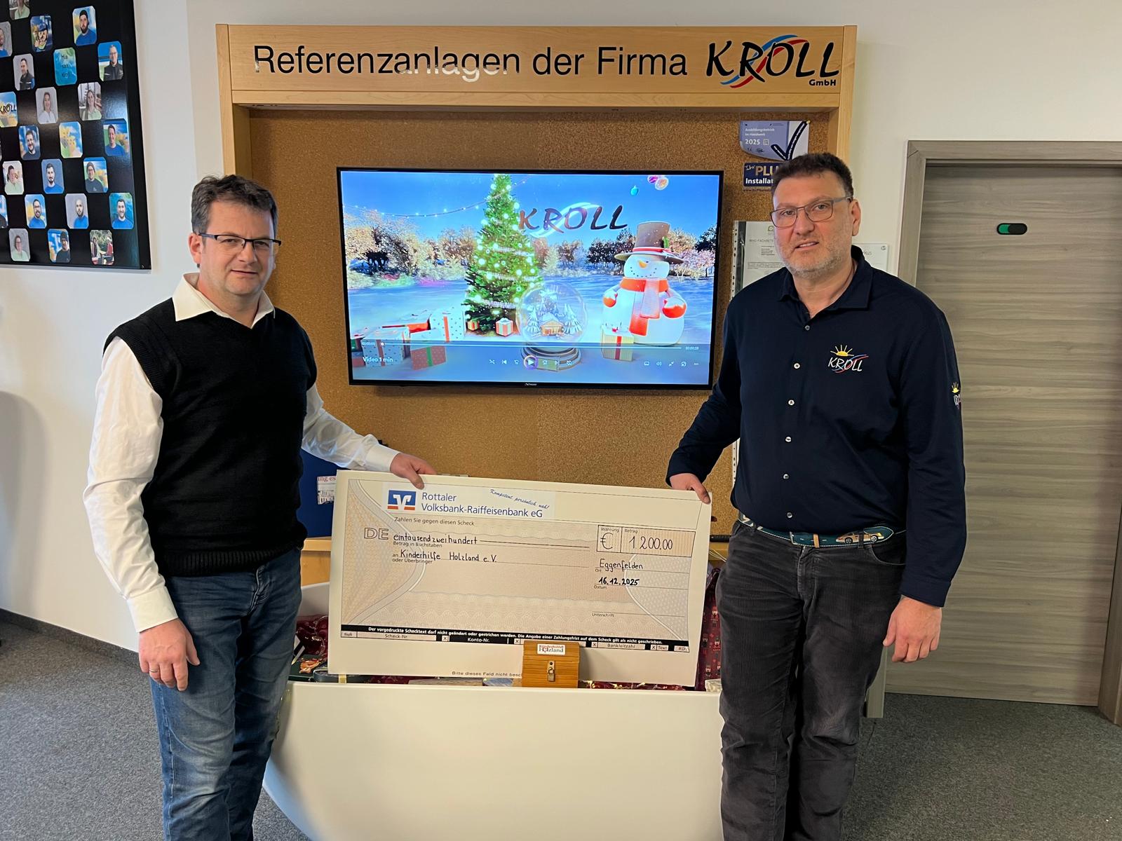 Die Firma Kroll hat auf Weihnachtsgeschenke verzichtet und diesen Betrag an die Kinderhilfe Holzland überwiesen. Vielen Herzlichen Dank an die Firma Kroll