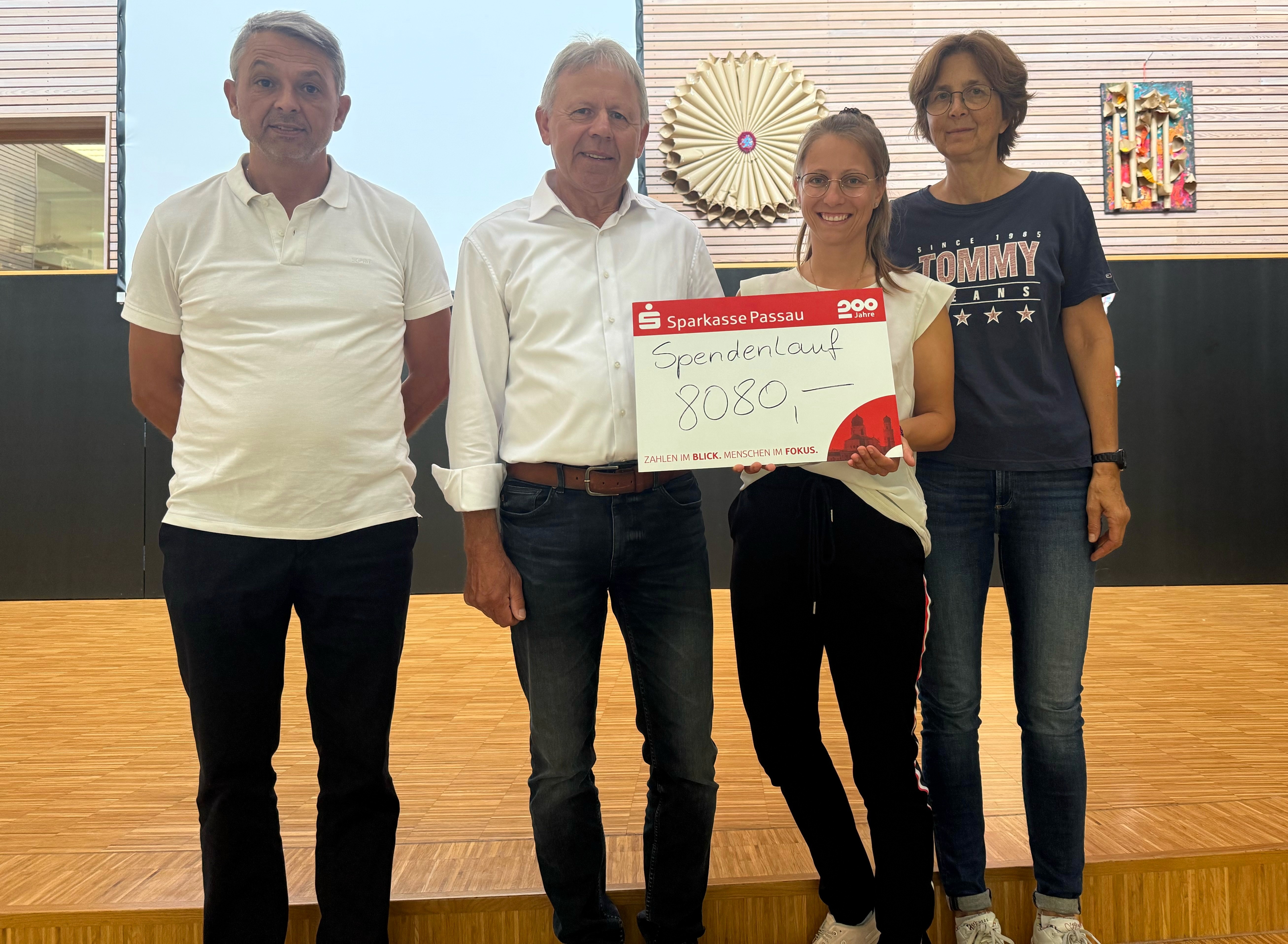 Über das Traumergebnis von 8080 Euro beim Spendenlauf der Kinder und Jugendlichen der Grund- und Mittelschule Fürstenzell freuten sich (v.l.) Konrektor Andreas Graf als kommissarischer Schulleiter, Peter Stuiber von der begünstigten „Kinderhilfe Holzland“, Organisatorin Simone Krompaß und Iris el Mahmoud, Mitarbeiterin in der erweiterten Schulleitung. – Fotos: Grund- und Mittelschule