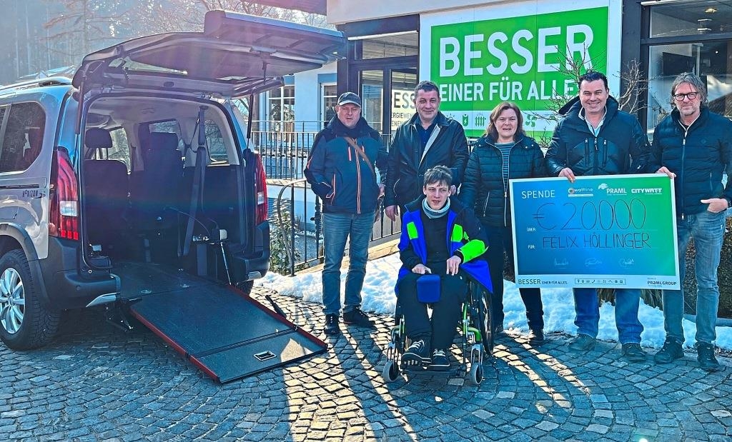 Die Praml Group hat 20000 Euro für ein behindertengerechtes Fahrzeug für Familie Höllinger gespendet. Der 15-jährige Felix lebt mit seiner Familie in Passau und besucht dort die Don Bosco-Schule. Er ist seit seiner Geburt körperlich eingeschränkt und auf einen Rollstuhl angewiesen.