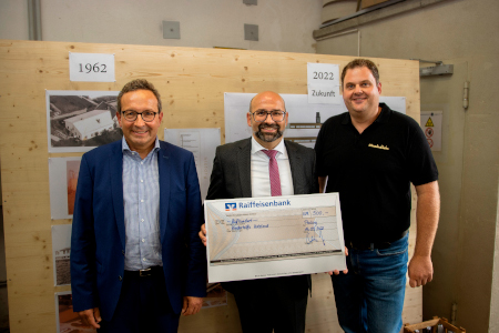 Präsentieren den Spendenscheck (von links): Rudolf Bachhuber, Geschäftsführer von Bachhuber Contact Bad Birnbach, Raiffeisenbank-Vorstand Josef Stahlberger und Schreinerei-Geschäftsführer Sebastian Seidl.