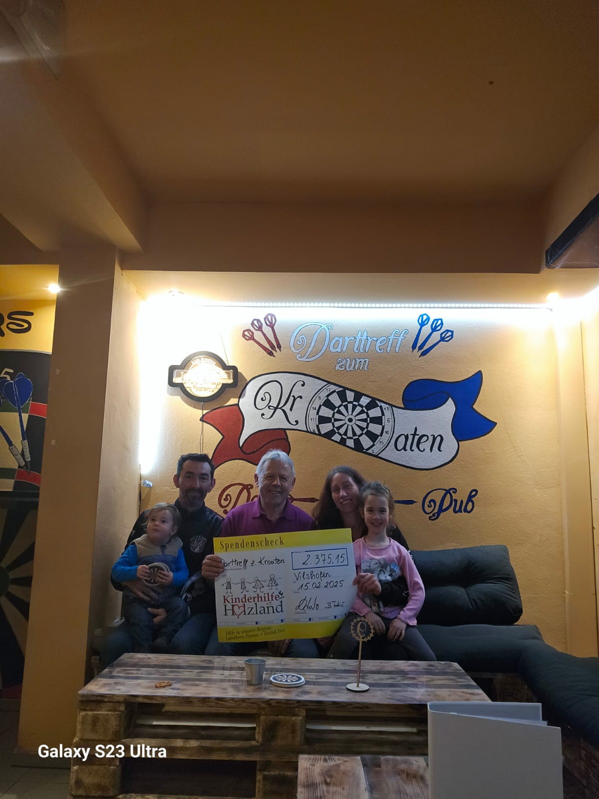 Anlässlich des Benifiz-Dartturniers am 15.02.25 konnte ein Scheck in Höhe von 2375,15 Euro, an die Kinderhilfe Holzland, übergeben werden.