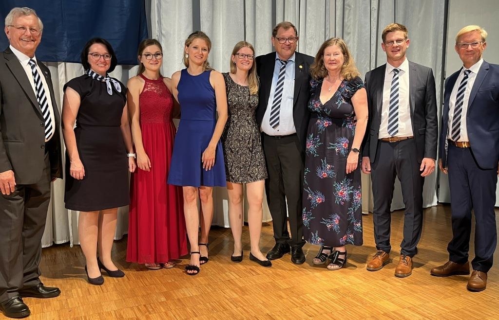 Das große Familienfoto – beruflich wie privat zu verstehen: Aufsichtsratsvorsitzender Josef Siglmüller (v.l.), Vorstand Martina Peña, die drei Töchter Sabine, Julia und Kathrin, Klaus Prähofer, Ehefrau Doris und die Vorstände Christian Bumberger und Mark Mühlberger. − Foto: Rücker